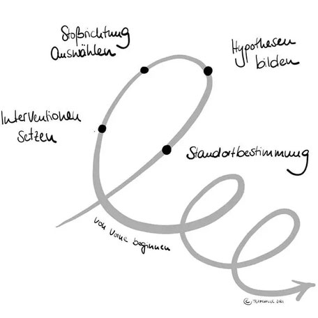 Nach Setzen der Interventionen beginnt die Schleife erneut. Wir beobachten, ob Veränderungen eintreten, bilden neue Hypothesen und damit die Basis für neue Interventionen.